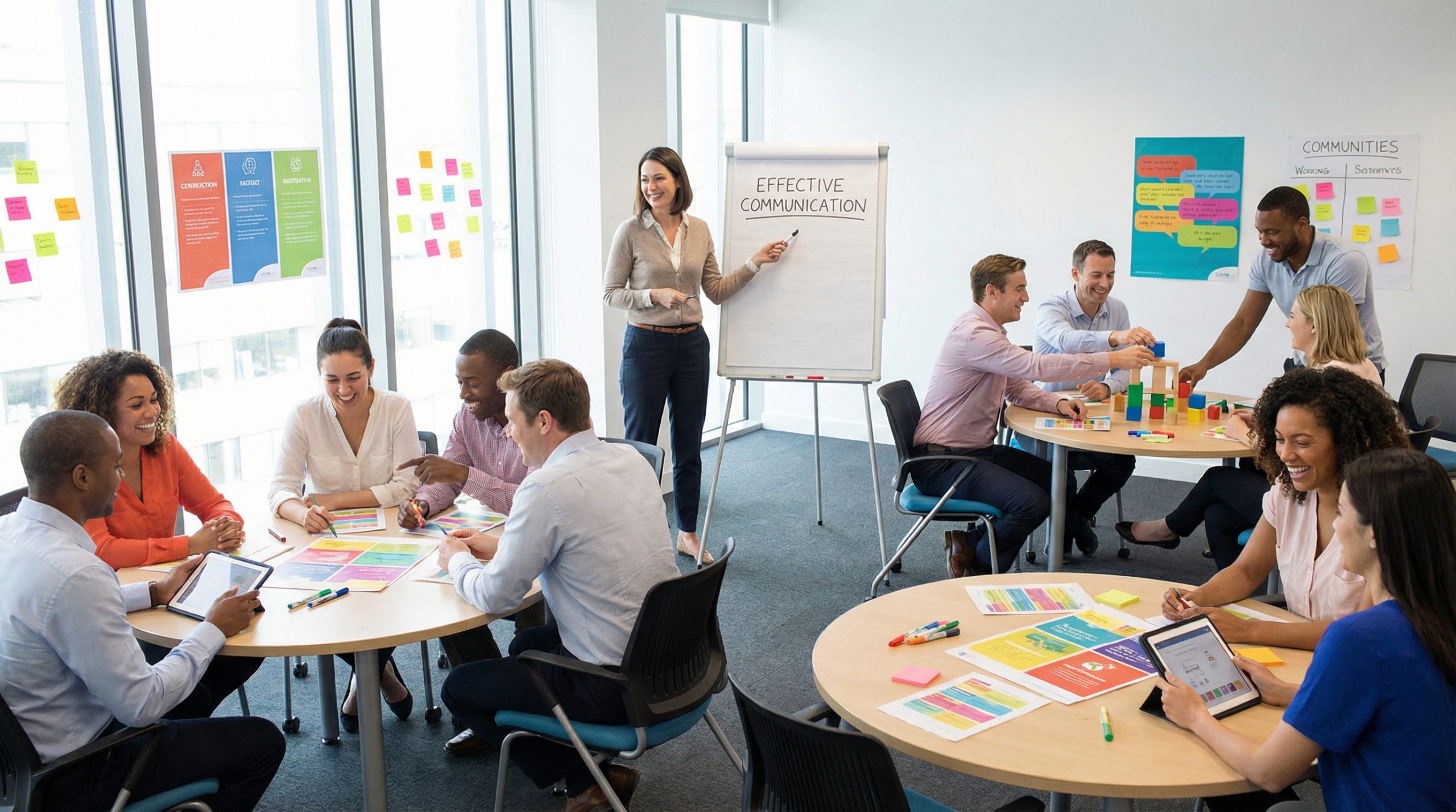 In-person workshops: Use physical activities — have people stand up, move to different stations, write on flip charts, build something with their hands. Your slides should prompt and support these activities, not compete with them. The slides go dark during hands-on work; they come back for debriefs and transitions.