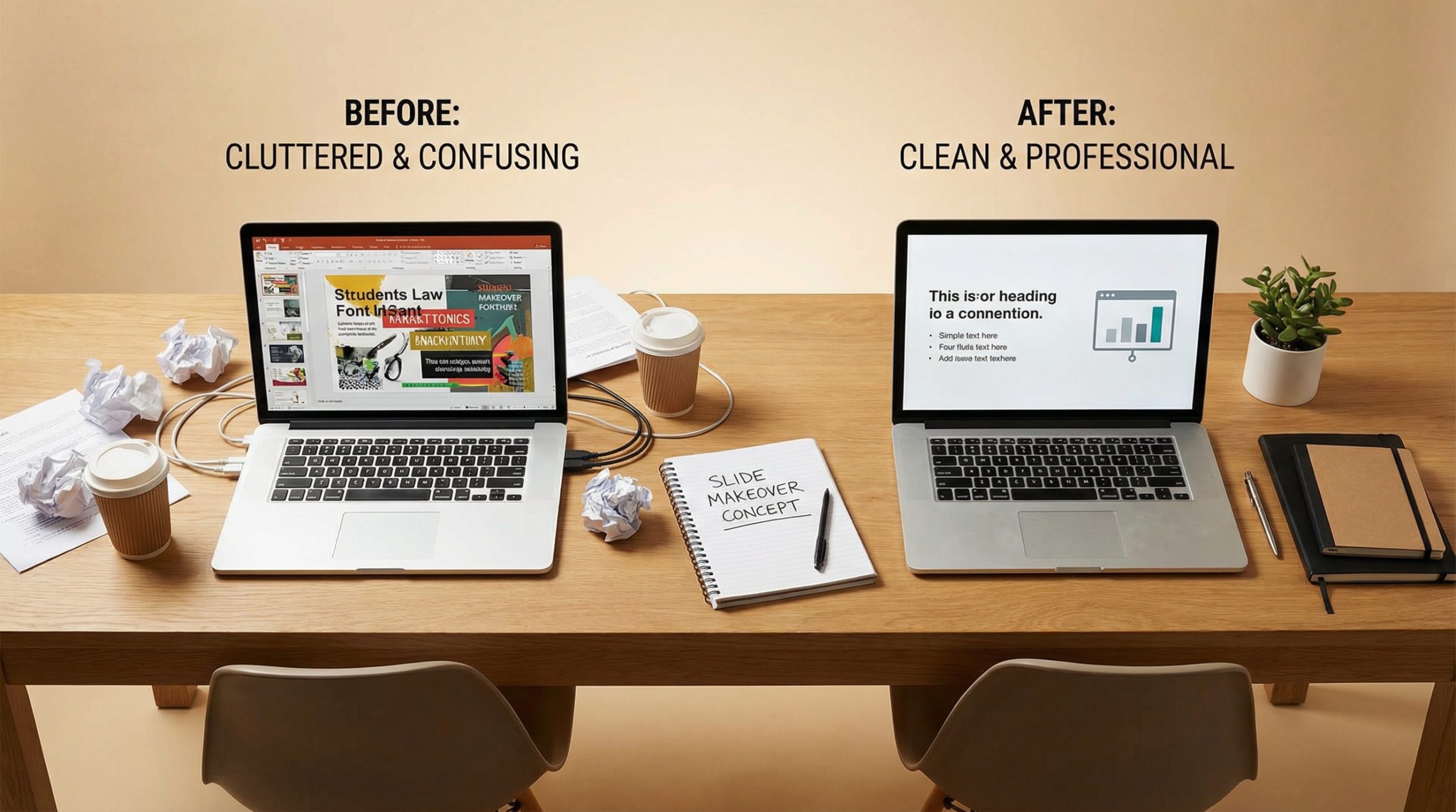 The before-and-after difference isn’t just aesthetic. When your slides are clean and focused, your delivery improves because you’re not reading from the screen. Your audience improves because they’re listening to you instead of decoding your slides. And your credibility improves because clean design signals competence, preparation, and respect for the audience’s time.